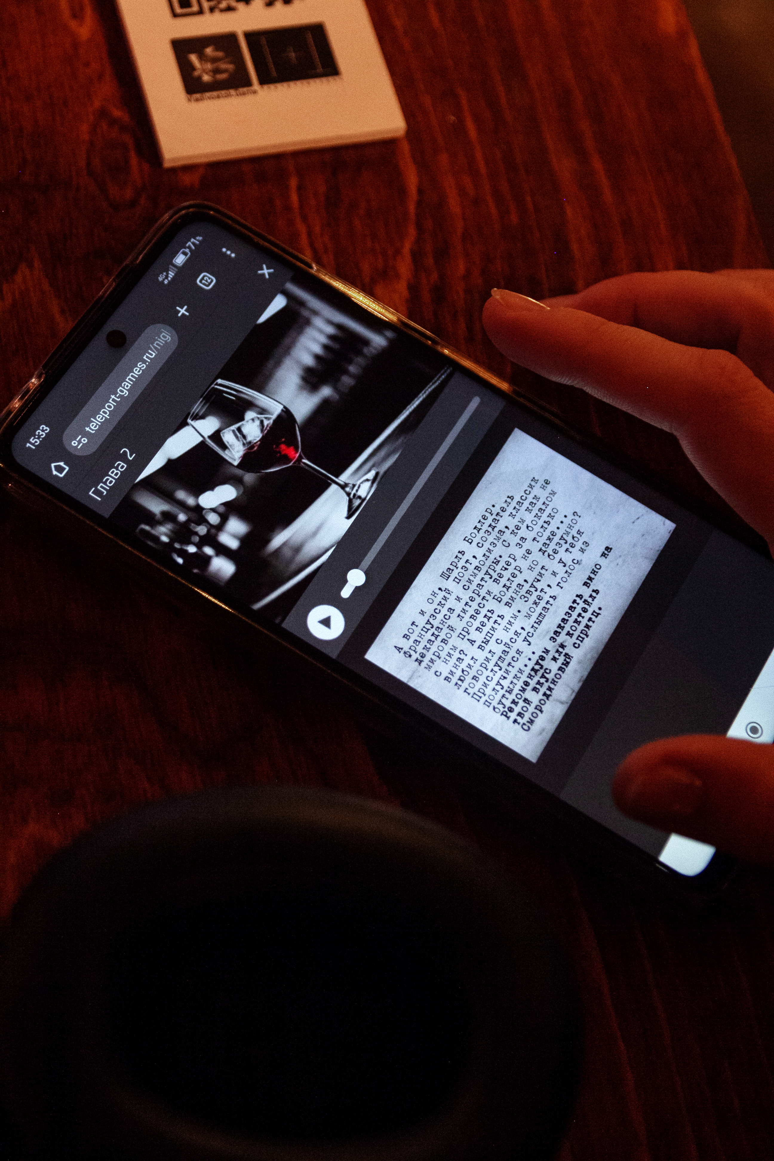 Погрузитесь в необычное вечернее приключение, где прогулка по барам превращается в художественный опыт. Вместо привычных экскурсий — аудиоспектакль, в котором самыми близкими спутниками станут культовые авторы: Чарльз Буковски, Шарль Бодлер и Венедикт Ерофеев. Они расскажут вам истории о страсти, боли, пьянстве, свободе и вдохновении — истории, которые звучат особенно ярко в мягком свете барных ламп и под вкус выбранного напитка. Вам нужно лишь открыть маршрут, включить звук и отправиться навстречу настроению вечера.